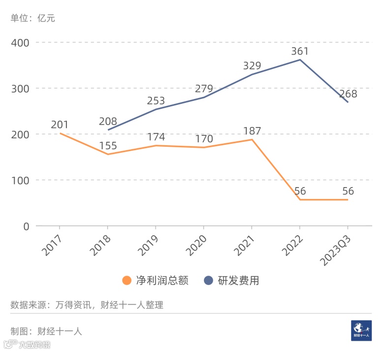 图8显示了2017年以来,行业每年的净利润总额和研发费用总额。2017年到2022年,行业净利润总额增长率为-22.5%。