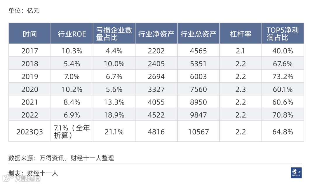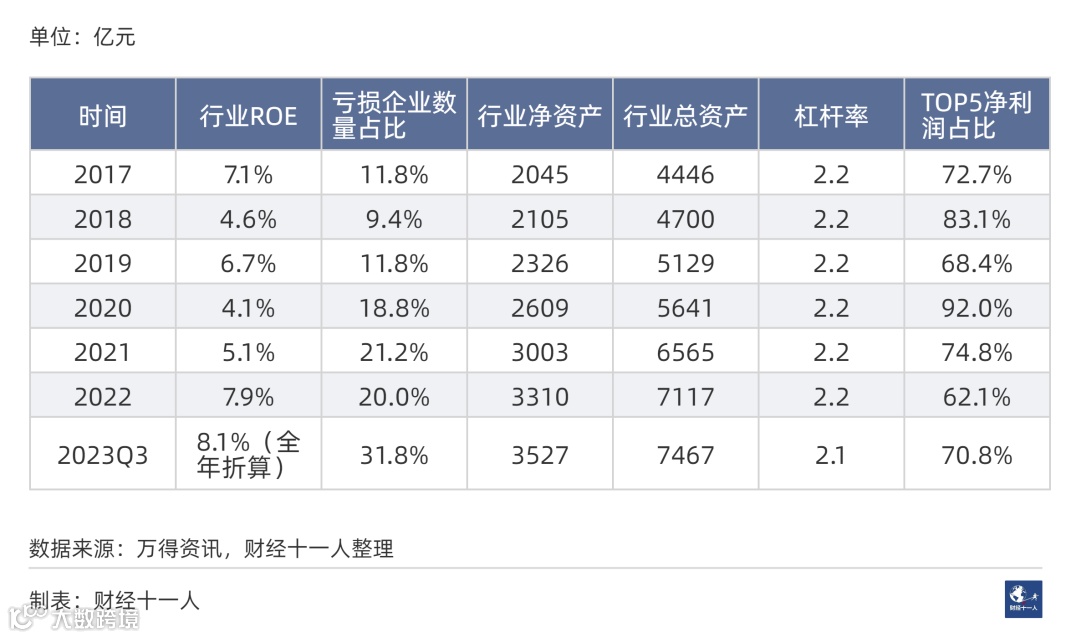 2022年和2023年,行业前5名基本稳定,它们在行业总利润中的占比大幅上升,不是因为前5名的盈利大幅提高,而是由于行业整体利润下跌到不足2021年的一半。