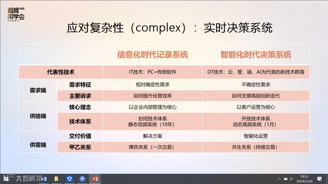 成为有竞争力的企业,尤其是领导厂商,你应当是一个客户运营商,实时洞察并满足客户需求变化。而要成为运营商应当是数据的运营商,实现从信息化时代的记录系统走向智能时代的决策系统,以实时决策系统应对复杂系统的不确定性。