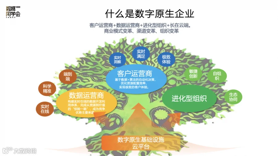 数字原生企业 = 客户运营商 + 数据运营商 + 进化型组织 + 长在云端。数字原生是基于“云原生”为代表的新型数字基础设施进行运营、管理、创新、发展的企业,构建新业务架构和组织架构,优化重构商业模式和决策机制,具备高速成长、敏感响应、快速迭代的特征,成为引领企业数智化的时代风向标。