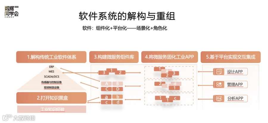 很多时候,行业领导者不得不以我为主,重新构建一套系统和解决方案,这是对传统的软件体系一次解构和重组,核心是通过软件的“组件化+平台化”来实现解决方案的“场景化+角色化”,具体而言就是将原有的工业软件体系不断地解构成了一些微服务组件库,无论是我们的库存管理、订单管理,我们的CAD、ERP、MES执行等等,这些传统的软件正在不断地拆分,分解,微服务化,构建起了一个微服务池,并基于平台实现交互集成,面向场景、面向角色重新地分装为面向特定问题的一个新的解决方案。这条路是行业领导者持续保持自己独特竞争优势的必然选择。