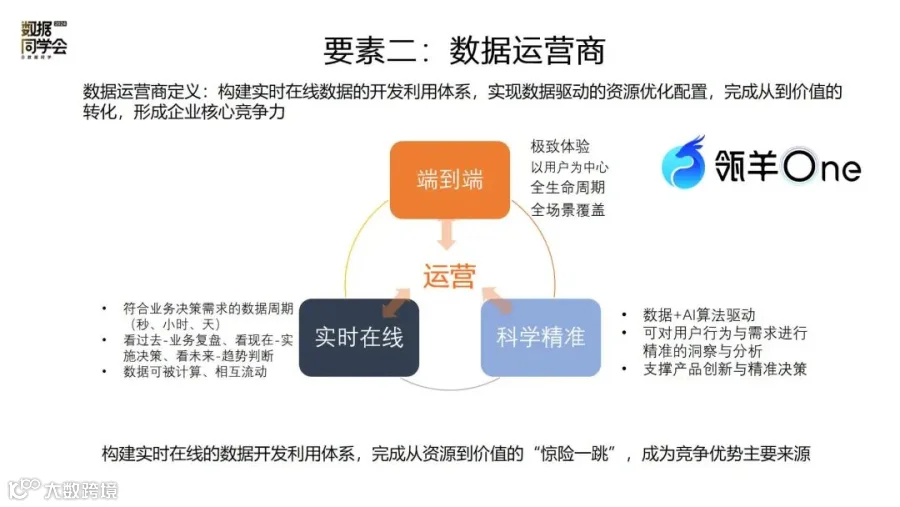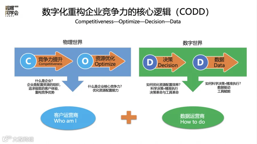 企业是一个配置资源的组织,需要构建自己的竞争优势。竞争优势的本质是对资源配置的效率,怎么样配置资源背后在于科学和精准决策。决策的依据来自于数据,在物理世界面对客户需求时,需要把自己打造成为客户运营商,同时基于这个运营商成为数据的运营商。