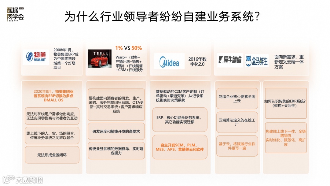 正是基于这个原因,物美、特斯拉、美的、盒马等很多企业纷纷自建业务系统,重构自身的软件系统和解决方案。例如2008年1月,物美集团ERP成为中国零售领域第一个灯塔项目,但是在2020年物美坚决“拆”了这个灯塔,重新构建了一套新的系统——多点DMALL OS。
