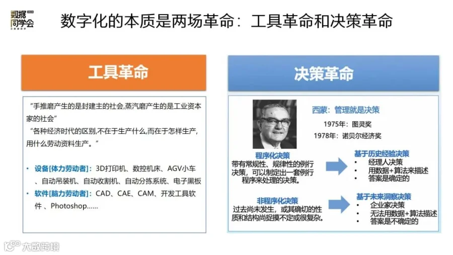 决策可以分为两类:程序化决策,由经理人决策;非程序化决策,以企业家的感觉、直觉做决策。数字化解决不了企业家直觉问题,但可以解决经理人的决策。