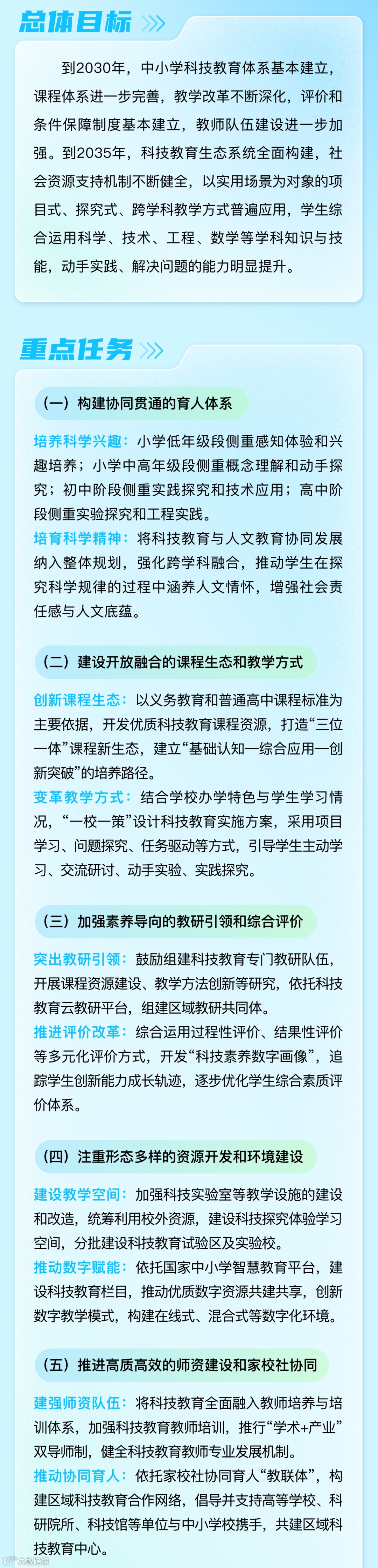 导读:2025年10月29日,教育部联合国家发展改革委、科技部、财政部、人力资源社会保障部、中国科学院、中国科学技术协会共同发布了《关于加强中小学科技教育的意见》。这份重磅文件为未来中小学科技教育的发展指明