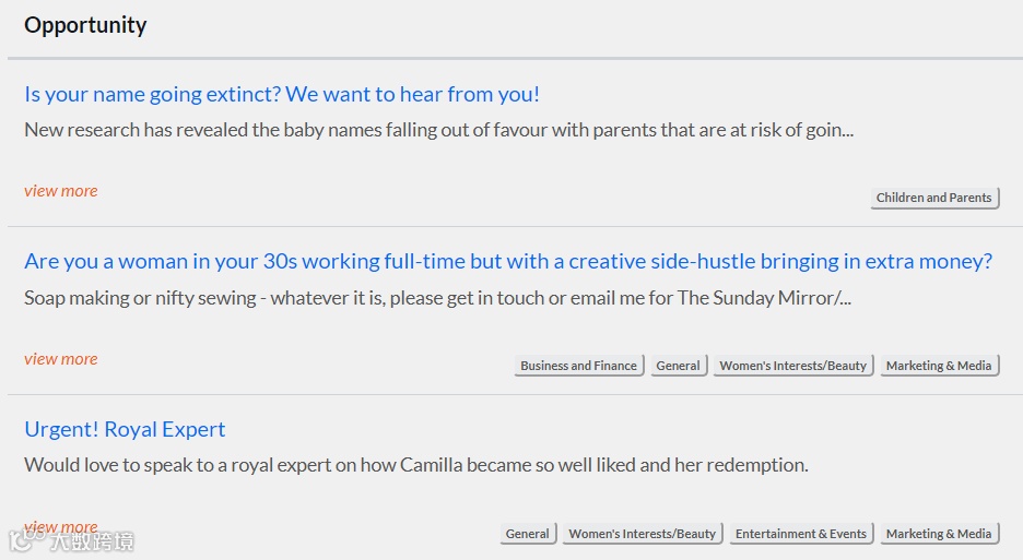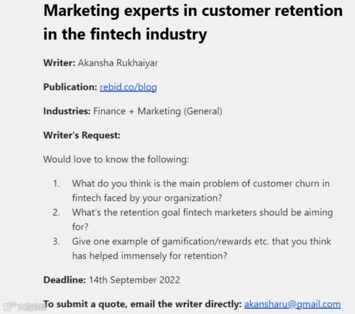 Help a B2B Writer是一个新平台,其运营方式与HARO类似,每天发送电子邮件,提供一些不同领域的潜在机会。在Help a B2B Writer这个平台上,查询往往是来自美国的超高权威、知名的B2B SaaS品牌,如Zapier。这对于中小型B2B企业十分有利。