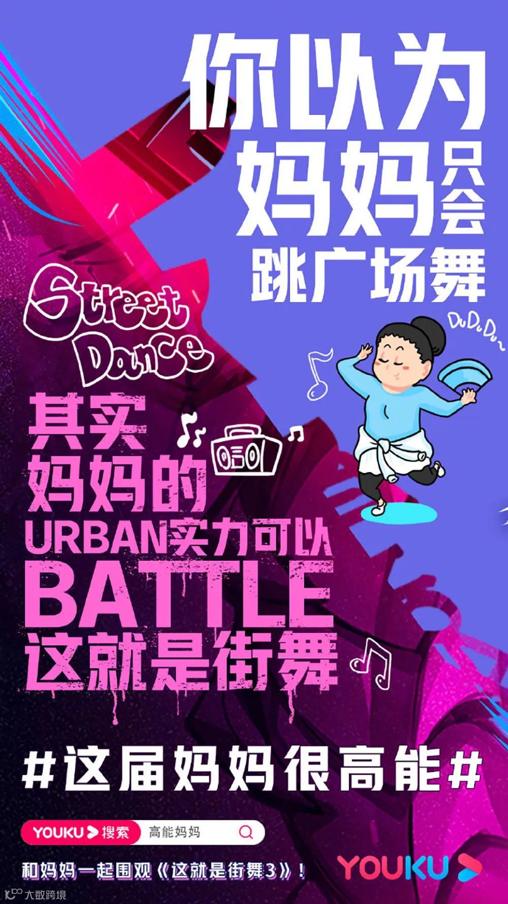 优酷以“这届妈妈很高能”为主题,展现妈妈们的兴趣与才华,同时推广《这就是街舞》节目。