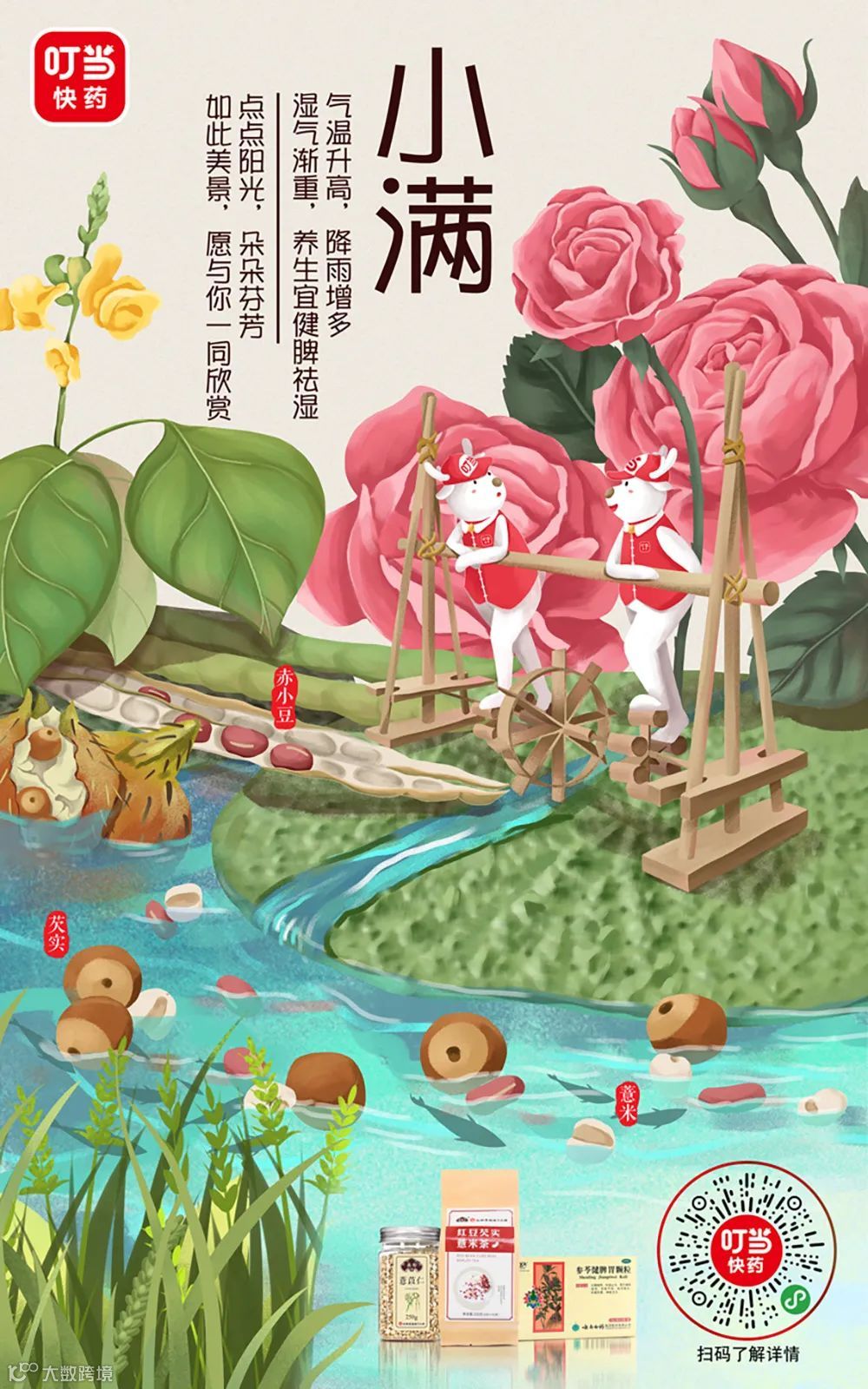 参考案例:搜狐新闻以“看会儿新闻,小满足,大收获”结合节气与产品价值;叮当快药、洽洽分别从气候与植物角度推广相关产品。