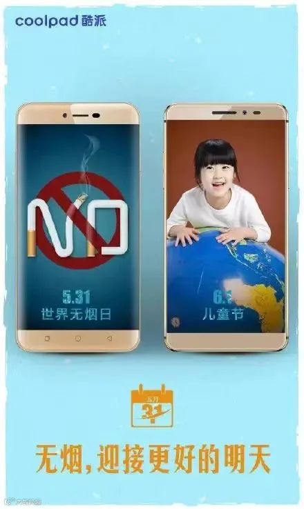 酷派手机结合六一儿童节主题,创新性地将禁烟标识与儿童照片融入产品宣传,以温情视角倡导健康未来,展现品牌社会责任感。