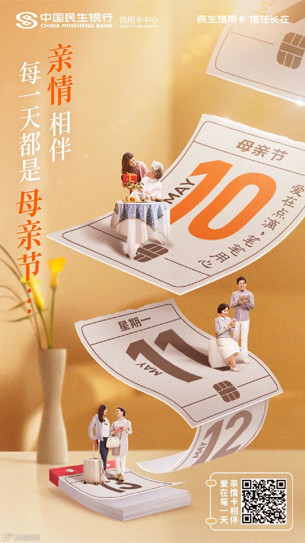 中国民生银行以“亲情相伴 每一天都是母亲节”为切入点,将信用卡与陪伴概念结合,强化品牌信任感。