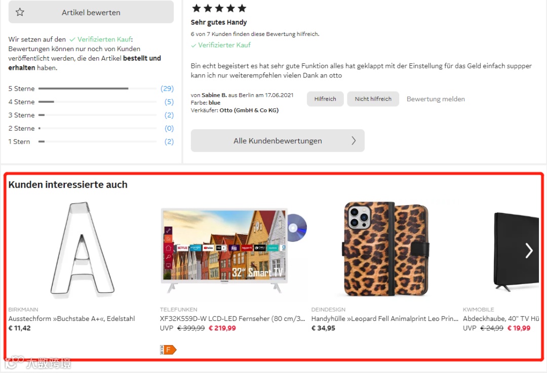 Otto 是德国的一个电商平台网站,他们会在产品页面中推荐其它品牌的产品,方便用户可以挑选其它客户也感兴趣的产品,如下图所示: