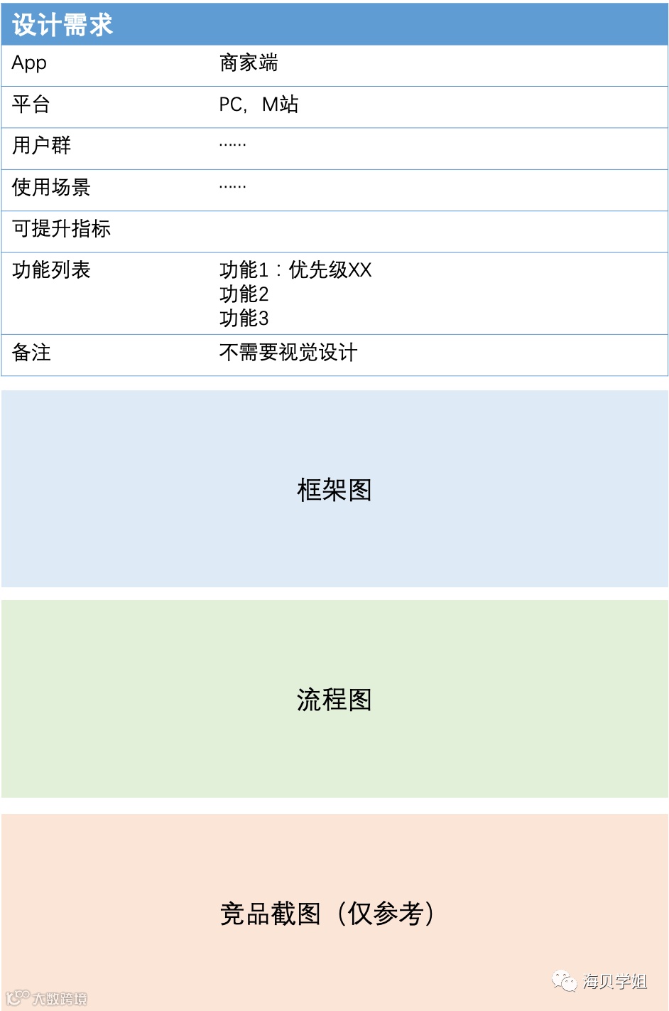 文档应包含:项目基本信息(平台、用户群、场景)、功能列表与优先级、是否需视觉支持、框架图、流程图、线框图及竞品参考图