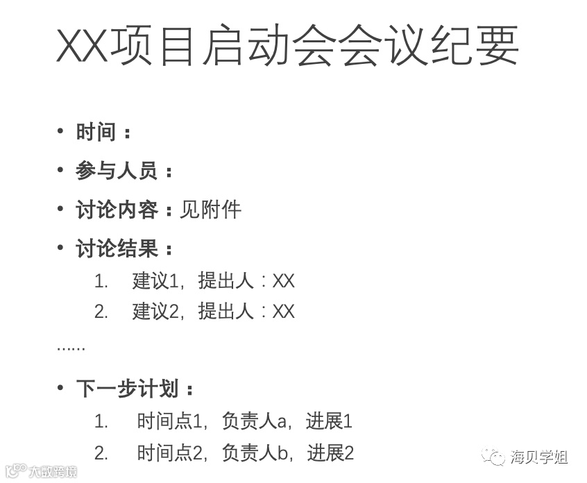 发布会议纪要,包含时间、参会人、提出问题、负责人及解决时限,并附上启动会PPT