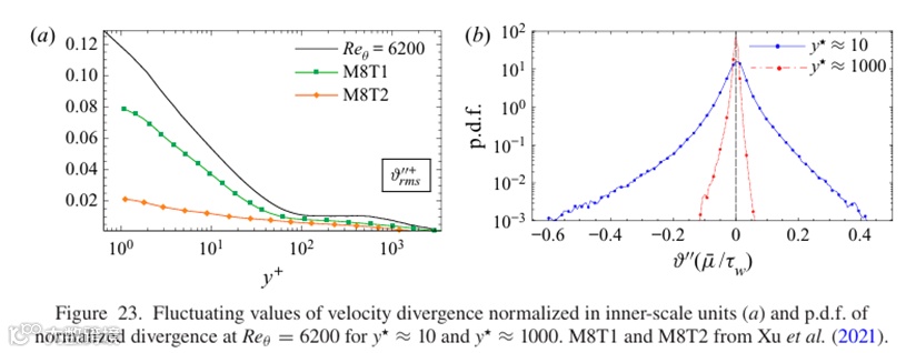 计算域纵向切片上的归一化密度梯度幅值如图 21 所示,从中可清晰看到这些结构。热力学变量的这种大幅脉动并未伴随流场的强烈活动,这一点可由域末端部分的半局部标度脉动速度散度的值得到证明(见图 22)。较强的膨胀事件出现在近壁处,其幅值随离壁距离的增加而单调减小,图 23(a)展示了这一情况,同时还给出了 Xu 等人(2021 年)的结果以供对比。图 23(b)显示了在壁面法向位置处计算得到的的两个概率密度函数。两种分布都略微偏向负值,这表明强压缩的发生略多于强膨胀,尽管在内层区域这种事件更为强烈。然而联合概率密度函数(未展示)并未表现出任何偏好相关性,这意味着即使边界层内可能存在激波,其数量和 / 或强度也不足以对热力学和动力学量产生显著影响。