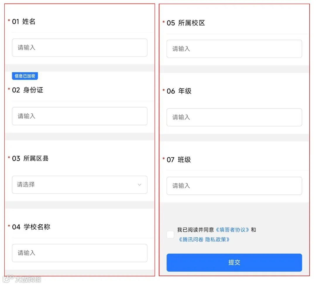 请在页面中完整填写个人申领信息,具体包括:姓名、身份证号、区、学校、所属校区、年级、班级。请务必如实、准确填写各项信息,确保信息完整无误后点击“提交”。