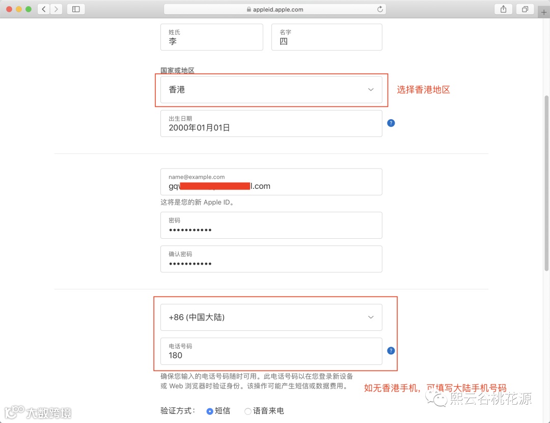 依次填写姓名、出生日期、未使用过的邮箱地址(推荐使用谷歌邮箱)、密码等信息;国家或地区选择“香港”;手机号码可使用中国大陆号码进行验证。