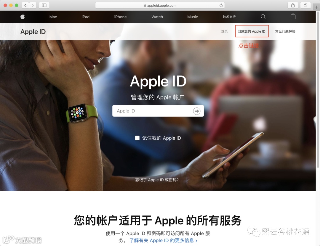 点击页面右上角“创建您的 Apple ID”链接,进入注册表单填写界面。