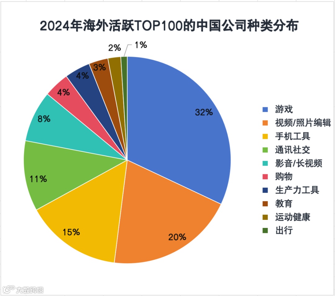 在TOP100榜单中,按品类分布,游戏以32款居首,视频/照片编辑类20款,手机工具类15款,通讯社交类11款,影音/长视频类8款。这表明海外用户的核心使用场景集中于娱乐、社交与内容创作。