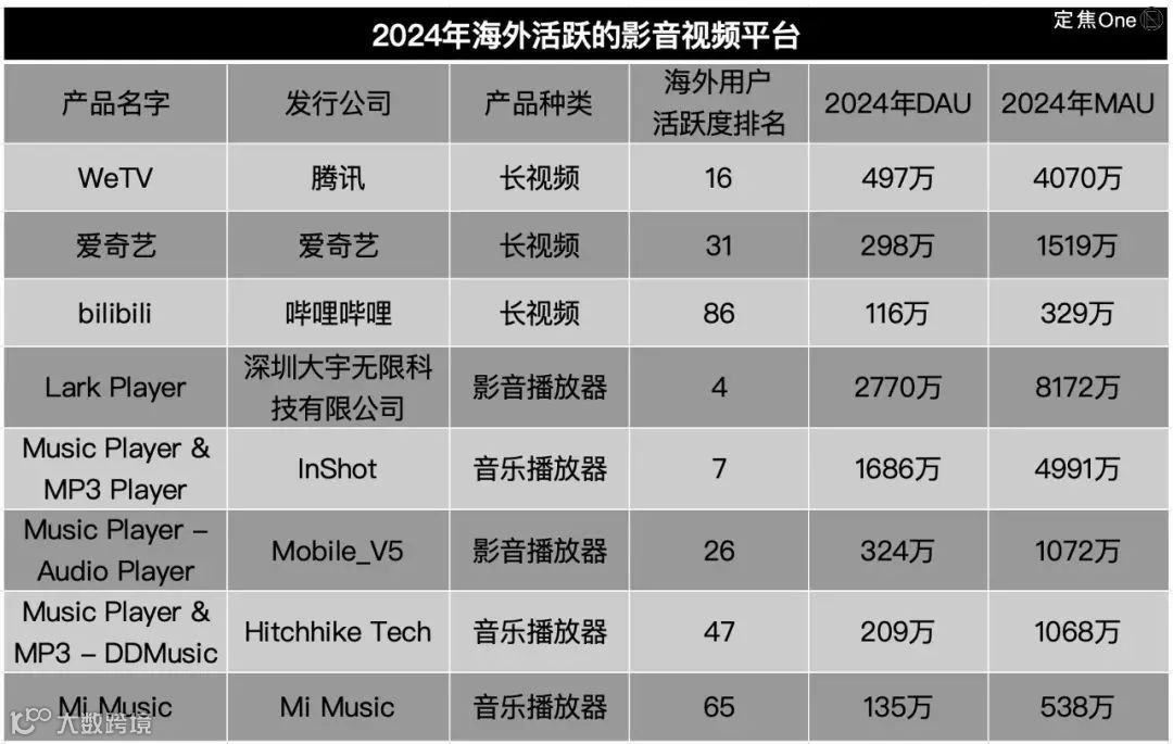音乐领域,Spotify与Apple Music占据主导地位,国内出海产品多聚焦影音播放器,有两款MAU达千万级,进入榜单前十。