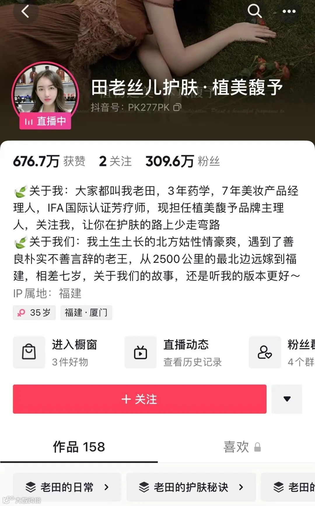 “防晒霜要不要天天涂?”、“不洗脸可以让皮肤变好?”这些护肤干货都出现在@田老丝儿护肤·植美馥予(以下简称“田老丝儿”)的主页。作为一位资深芳疗师,田老丝儿将实践经历浓缩成经验,创立功效护肤品牌植美馥予,并通过抖音直播间快速崛起。
