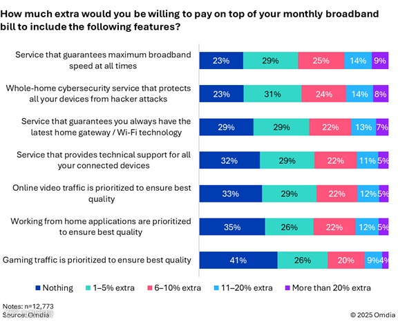 网络安全采用意愿为宽带运营商带来巨大收入潜力。Omdia《2024年数字消费者洞察》调研显示,在考虑额外宽带费用时,消费者将网络安全置于所有其它增值服务之上,这为电信运营商提供了一个立即调整其价值主张的机会。为拓展这一市场,电信运营商应实施分层进入策略、免费增值转化路径、家庭防护宣传、按设备数量定价以及威胁可视化界面。