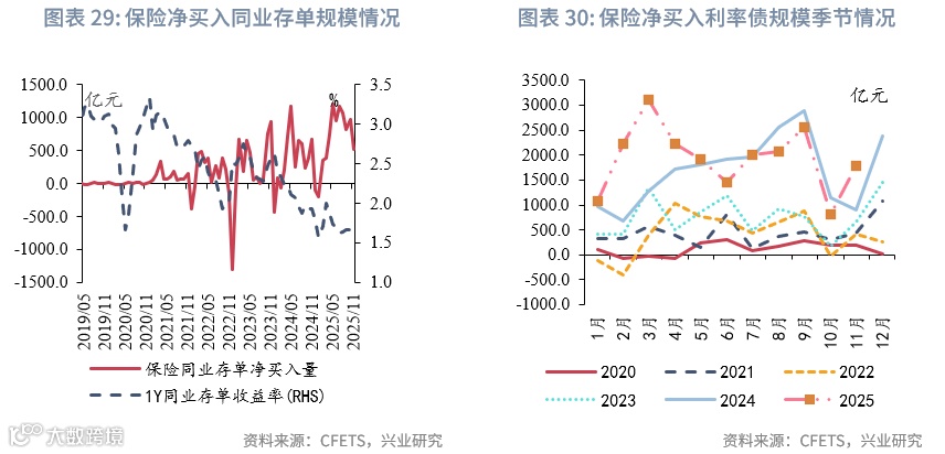 理财净买入较多同业存单。11月理财净买入全部类型债券约为2066亿元,净买入规模处于2019年以来66%分位数水平。其中,净买入利率债、信用债、同业存单的规模分别约为228亿元、349亿元、1329亿元,净买入规模分别处于2019年以来30%、40%、74%分位数水平。2025年全年,理财规模整体保持稳定增长,季节性波动特征较往年有所减弱。