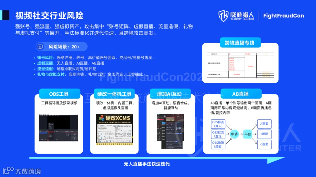 比如,无人直播的作弊手法,从OBS工具,到后来的硬改一体机内置虚拟摄像头,再到增加AI智能互动,再到近期的AB直播,新的对抗手法出现高频。