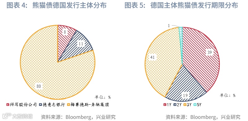 ● 中方欢迎并支持符合条件的德国机构在华发行熊猫债。德国在熊猫债市场的参与度仍有较大提升空间。尽管其历史总发行量在所有境外主体中排名第三,但主要由2016至2019年间的发行活动贡献,此后市场趋于清淡。截至2025年11月18日,德国熊猫债的未偿余额为140亿元人民币,仅占市场总规模的3.5%,存量规模有限。目前,发债主体高度集中于梅赛德斯奔驰集团、德意志银行及拜耳股份三家[3]。债券期限以1年期和3年期为主。