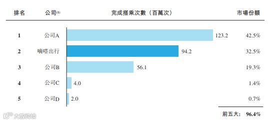 弗若斯特沙利文数据显示,按已完成顺风车订单数计,2019年,嘀嗒出行顺风车的市占率为66.5%,为中国最大的顺风车出行平台。