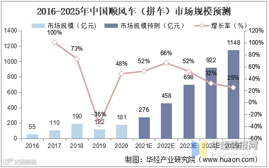 因可以高效匹配有“顺风”需求的车主和乘客,2015年后,中国网约车市场飞速成长。华经产业研究院披露的数据显示,2018年,中国顺风车行业市场规模为190亿元,约为2015年55亿元的3.5倍。预计2025年,中国顺风车行业市场规模达1148亿元,过去十年的复合年增长率为35.51%。