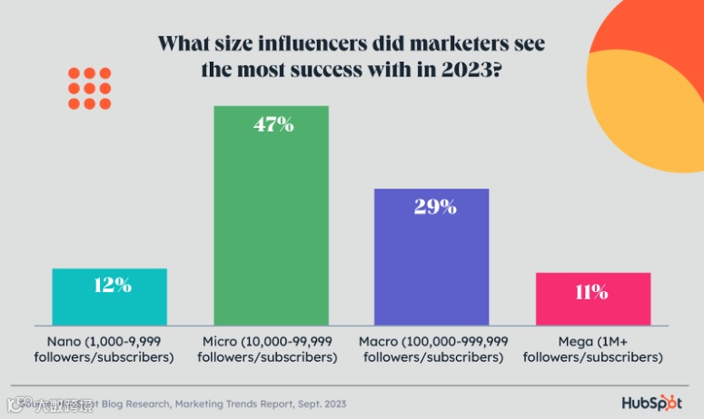 2023 年,大约一半的营销人员与影响者或创作者合作,其中 64% 与微型影响者合作,使他们成为最受欢迎的影响者类型。