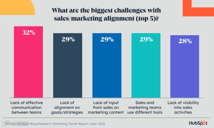 单一事实来源直接解决了营销人员在销售和营销协调方面面临的最大挑战 - 团队之间、使用不同工具的销售和营销团队之间缺乏有效的沟通,以及团队之间难以共享数据都是主要缺点。