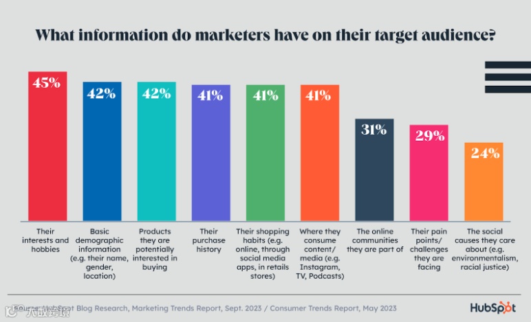 当我们询问营销人员对目标受众的了解时,只有不到一半的人知道他们在哪里消费内容、他们的人口统计信息、他们的兴趣和爱好、他们感兴趣的产品以及对他们购物习惯的洞察。