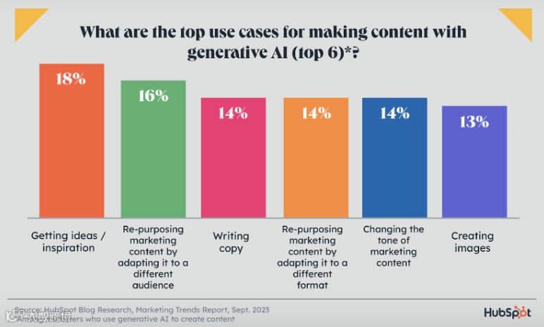 我们调查的营销人员告诉我们,生成式人工智能的主要用例是数据分析、研究和内容创建(但是,不要停止阅读这里)。