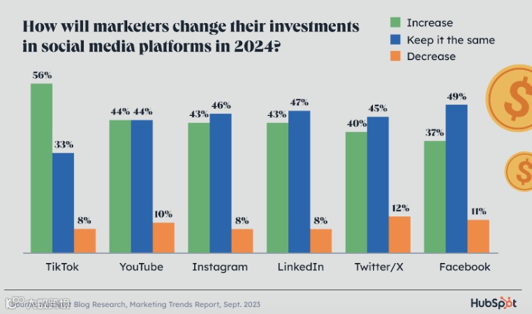 56% 使用 TikTok 的营销人员明年将增加投资,这是所有平台中最高的。 YouTube 和 Instagram 的投资也将大幅增加。