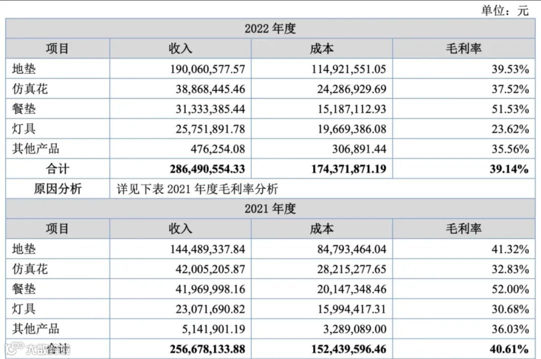 其中,地垫是镁锦股份贡献最大的产品线,2022年收入接近2亿元。其次是仿真花、餐垫和灯具,都有千万以上的收入规模