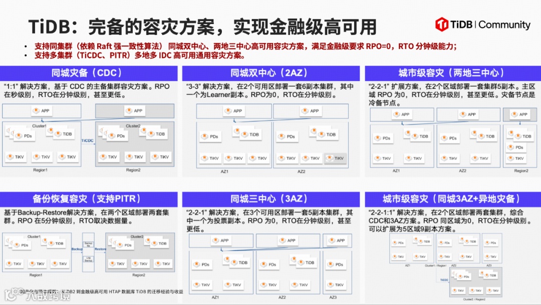 TiDB 则基于分布式架构重构了高可用能力:其底层依托 Raft 分布式共识协议实现数据多副本(默认 3 副本)强一致同步,任意节点故障时,Raft Group 可自动选举新 Leader 提供服务,无需人工介入,故障恢复时间可控制在 30 秒以内;同时,TiDB 天然支持“两地三中心、同城双活”等容灾架构,无需绑定专属硬件,即可满足金融行业“RPO=0、RTO<30s”的高可用标准,进一步降低了容灾部署与运维的复杂度。同时,TiDB 也有着非常完善的容灾方案。