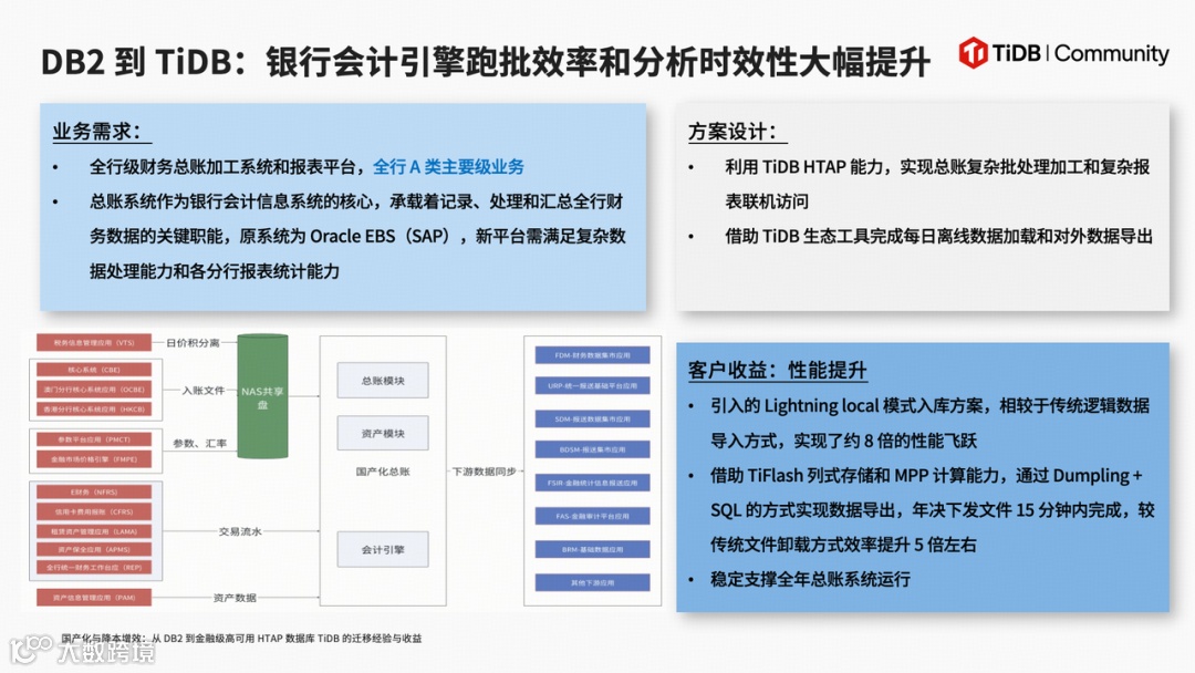某银行会计引擎系统作为全行 A 类核心业务,承担着财务总账加工、报表统计等关键职能,此前依托 Db2 运行时面临数据处理效率低、文件下发耗时久等痛点,迁移至 TiDB 后,借助 HTAP 架构同时支撑总账复杂批处理与报表联机访问,搭配 Lightning local 模式实现数据导入性能提升 8 倍,更依托 TiFlash 列存+ MPP 计算能力,将年决文件下发耗时从 1 小时以上压缩至 15 分钟,效率大幅提升,全程稳定支撑全年高负载运行,保障了核心财务数据处理的连续性。