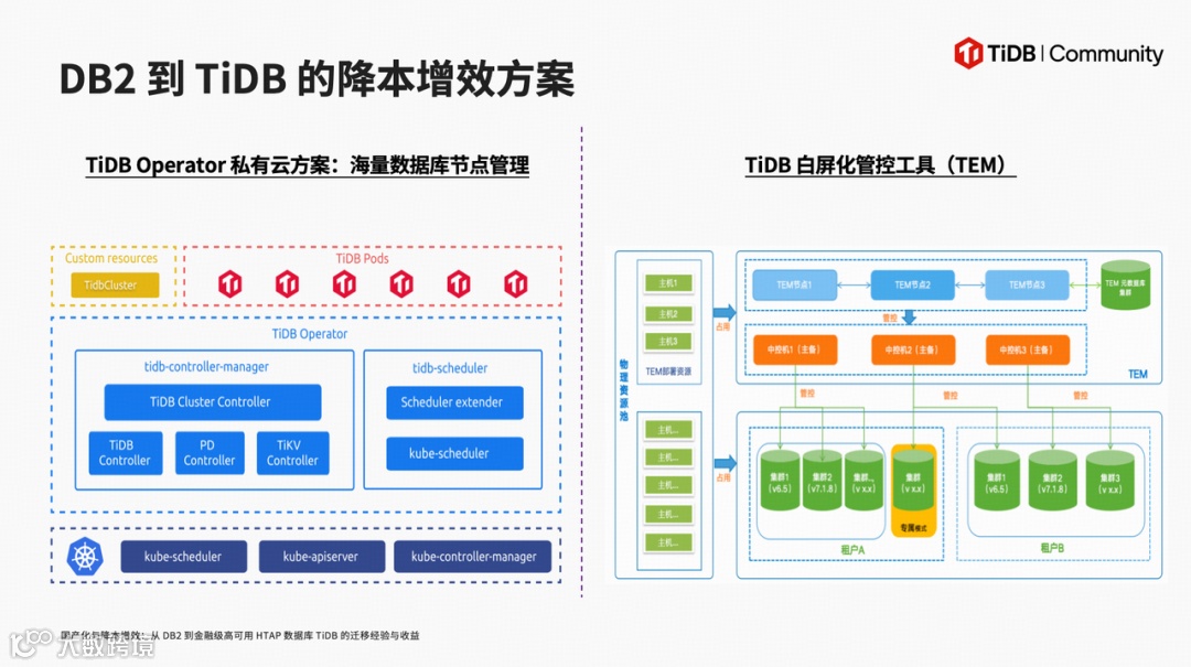 Db2 运维管理长期面临节点多、环境杂、自动化弱、观测性差等痛点,而 TiDB 通过 Operator 私有云方案与白屏化管控工具,大幅降低运维成本:TiDB Operator 基于 K8s 实现单集群、同城双中心等架构的一键部署,结合 DBaaS 管控平台实现可视化运维,既提升资源利用率,又避免厂商技术绑定;白屏化管控工具(TEM)则通过物理资源池与集群管控,统一多环境运维标准,减轻运维负担。