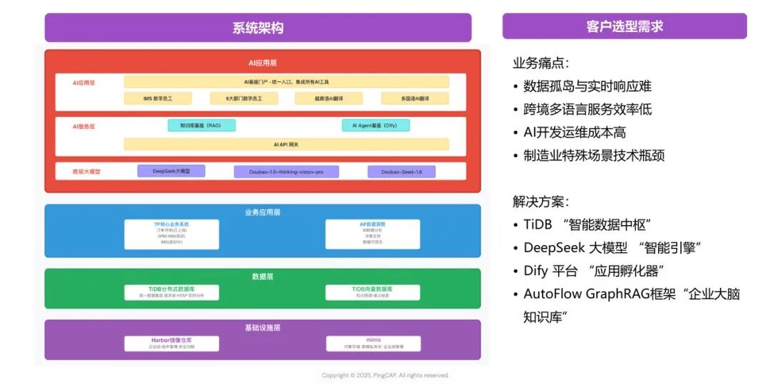 知识图谱构建:基于 TiDB 的 GraphRAG 框架,将工艺文档、客服对话历史转化为知识图谱,结合 DeepSeek 大模型及 Dify 构建多功能 AI Agent 实现多语言实时翻译与故障解答;