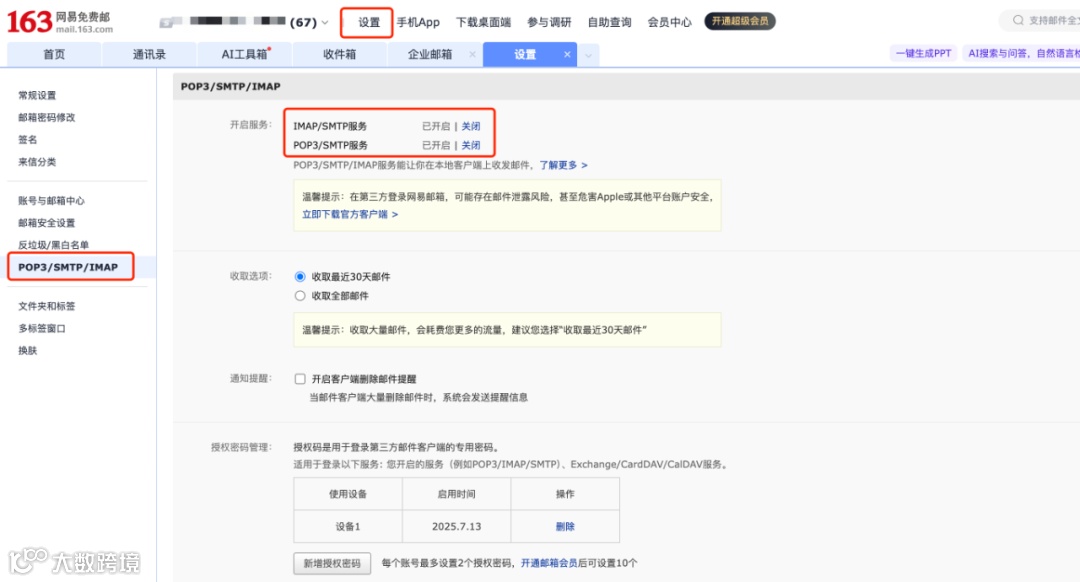 点击左侧菜单中的「POP3/SMTP/IMAP」,并开启两个 SMTP 服务; -