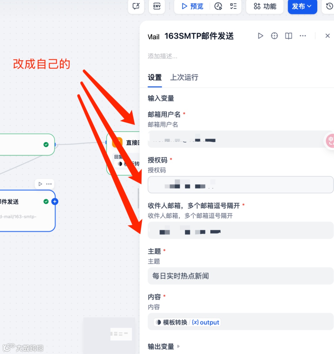 替换工作流中邮箱的名称、授权码和收件人邮箱即可。