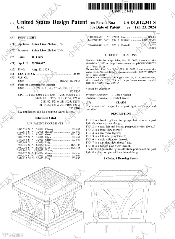 经查询,这款产品于2023年8月22日在美国进行外观专利申请的提交,于2024年1月23日获得了公告。