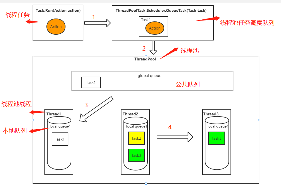下图中 Task1先进入全局队列,随后被 Thread1 领走。Thread3 通过 WorkStealing 机制窃取了 Thread2 中的 Task3。