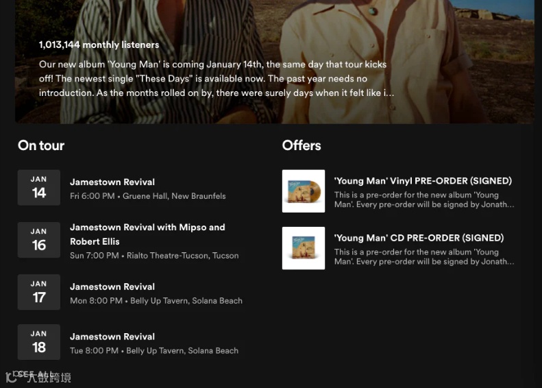 例如,您可以查看 Jamestown Revival 的巡演日程并从 Spotify 预订他们的最新专辑。