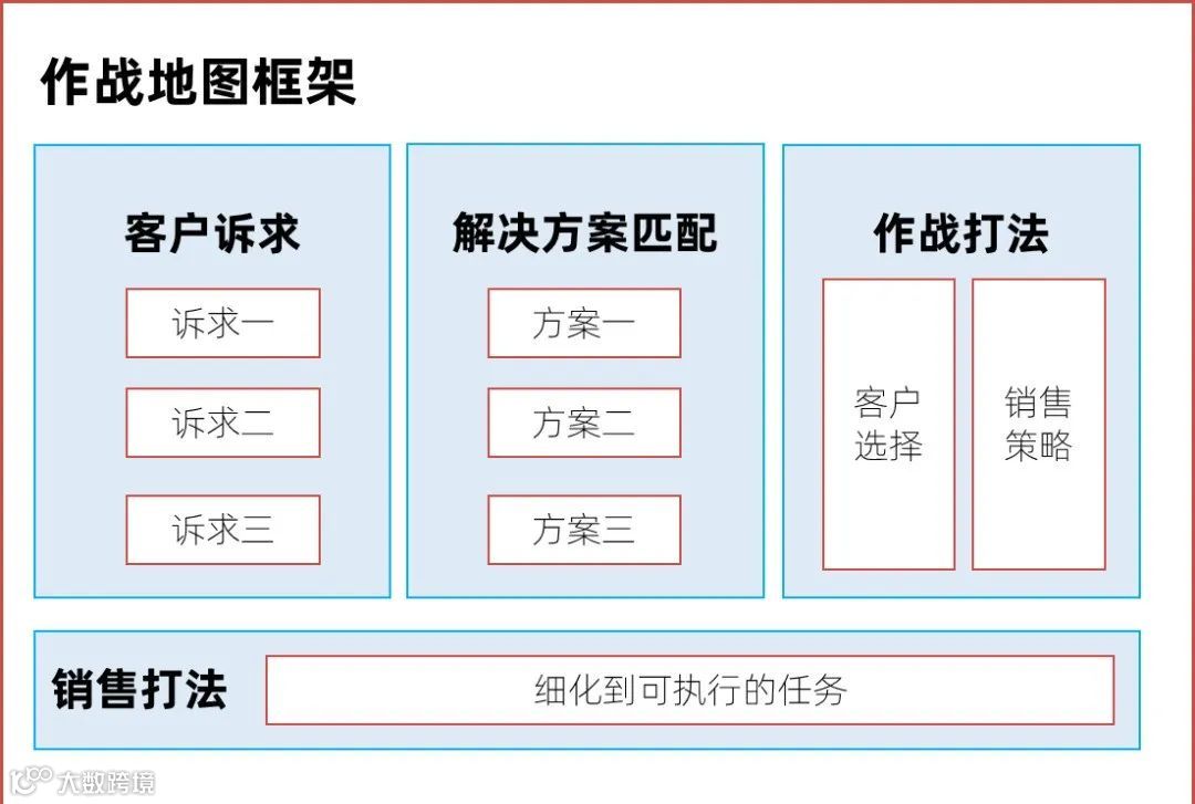 作战地图的第一部分是研究清楚客户诉求是什么,第二部分是基于客户诉求制定解决方案,第三部分是基于前两者制定作战打法,并且细化到选择什么样的客户,用什么样的策略。