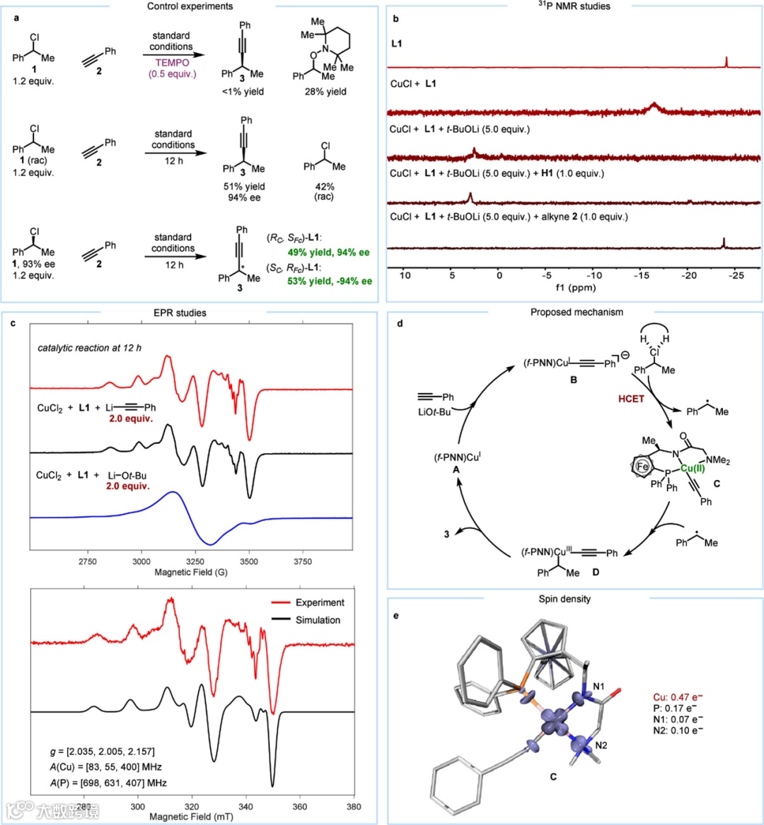 该方法展现出优异的底物适用性:不同电性取代基的苄氯、杂环氯代物、药物分子衍生物等均能高效转化,获得高收率与高对映选择性(高达94% ee)。炔烃底物范围广泛,包括芳基炔、烷基炔及生物活性分子衍生物,进一步展示了该方法的合成价值。(Figure 4)