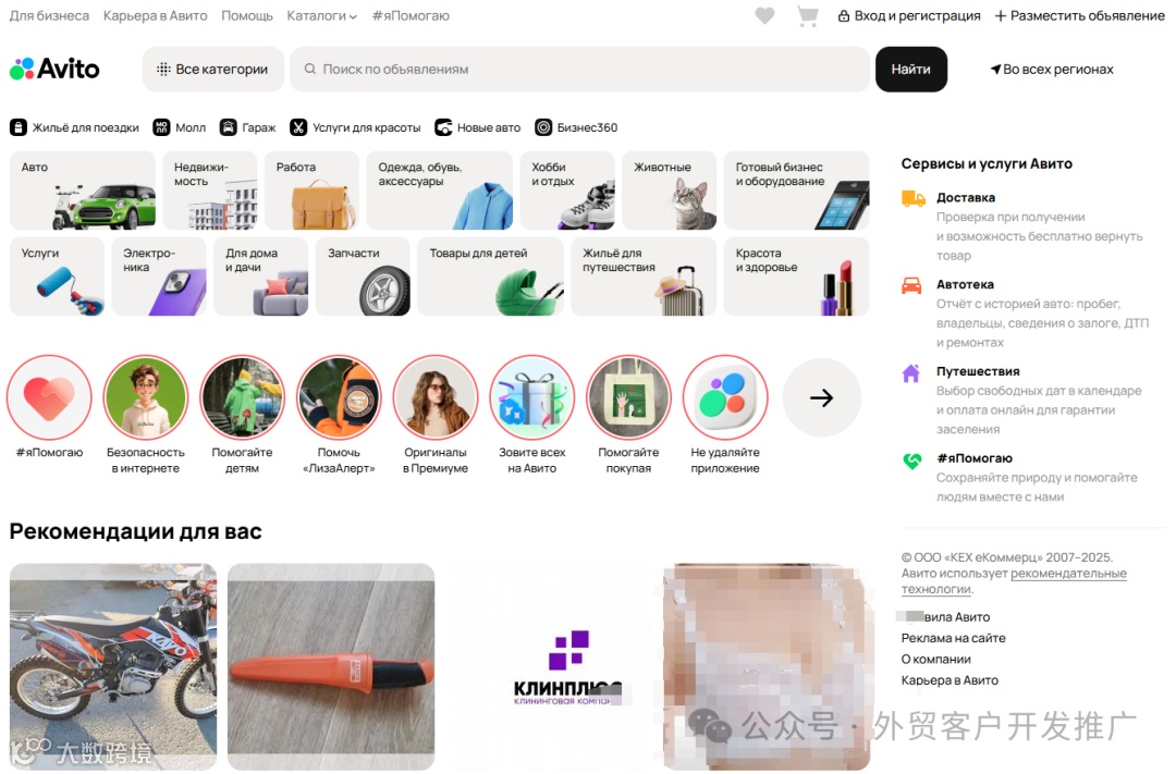 :俄罗斯最大的分类广告平台,2024年市场占有率达62%,商品交易总额(GMV)同比增长144%。平台月活跃用户超6200万,累计发布超2亿条广告,每秒成交约8笔,覆盖个人与中小企业客户。