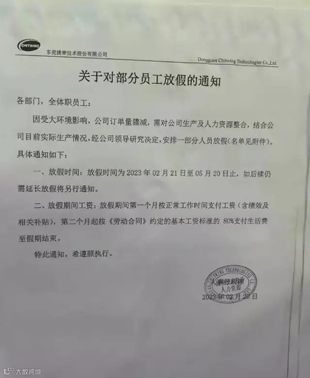 受全球订单下滑影响,东莞捷荣技术股份有限公司通知部分员工放假3个月,从第二个月起发放80%基本工资,凸显制造业面临严峻挑战