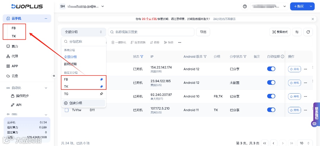 DuoPlus支持用户将云手机分组添加到左侧菜单列表,用户可以根据自身需求和使用习惯,自定义分组列表,查找云机更省时。